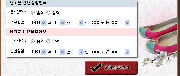 ¤ý¹«·á±ÃÇÕÀº ³²³àÀÇ »ý³â¿ùÀÏ »çÁÖ¸¦ ±âº»À¸·Î ÇÏ´Â Á¤Åë æ¶ùÊ¿¡ ±âÁØÀ» °¡Áý´Ï´Ù.
